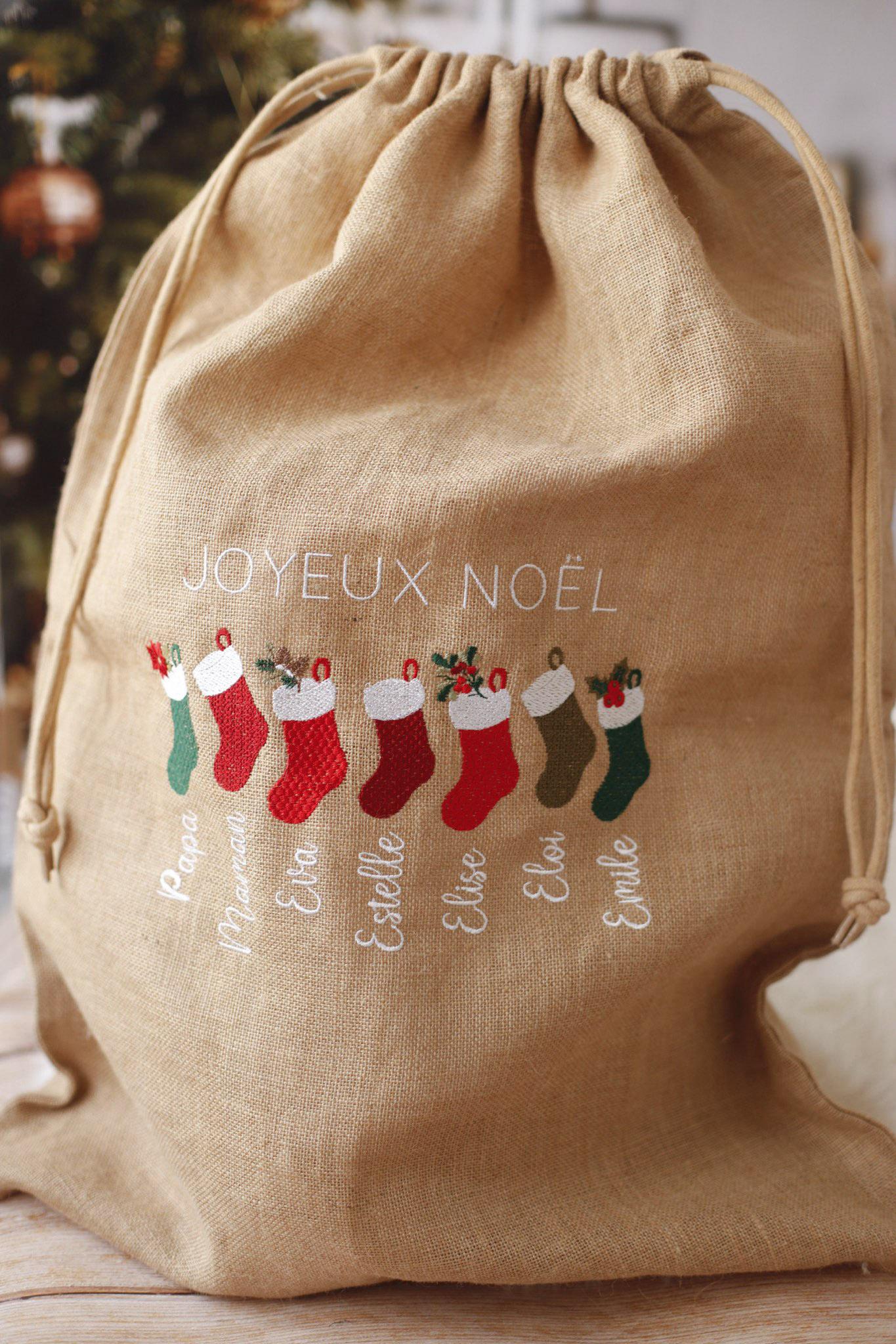 La hotte de noël est un joli sac pochon en toile de jute ou coton brodé entièrement personnalisable.