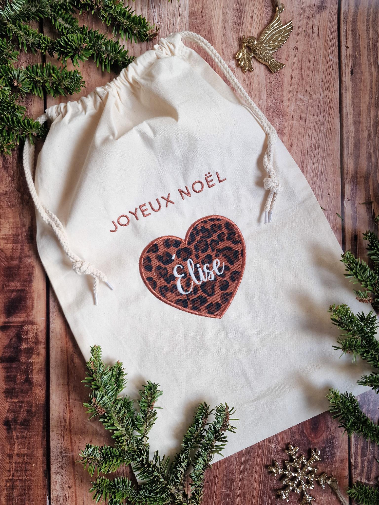 La hotte de noël est un joli sac pochon en toile de jute ou coton brodé entièrement personnalisable.